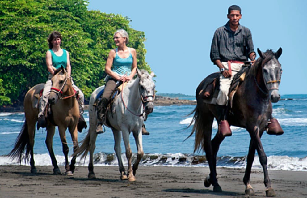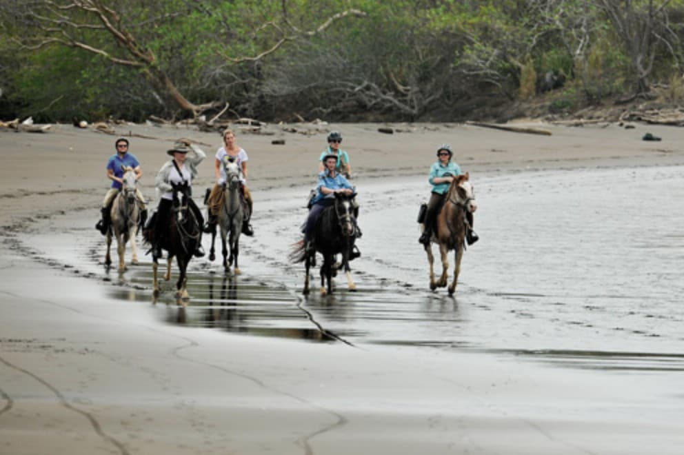 This morning, we will walk to the stables and ride along the picturesque Playa Negra (Black Beach), then part of the way along the village road to Playa Grande (Long Beach) – a secluded, peaceful, and deserted Caribbean beach ideal for pleasant gallops. We will then enter a beautiful tropical forest, where you may spot howler monkeys, sloths, and a variety of exotic birds such as toucans. Your expert guide will introduce you to the local flora and fauna. During one of the stops, while the horses rest in the shade of a tree, your guide may demonstrate his coconut peeling techniques using a machete! If time allows, on the return route, we will stop to visit some lovely local craft shops and souvenir stores and enjoy an excellent Caribbean lunch at a local restaurant. The afternoon is free for optional local excursions or to rent a bike or surfboard (extra charge).