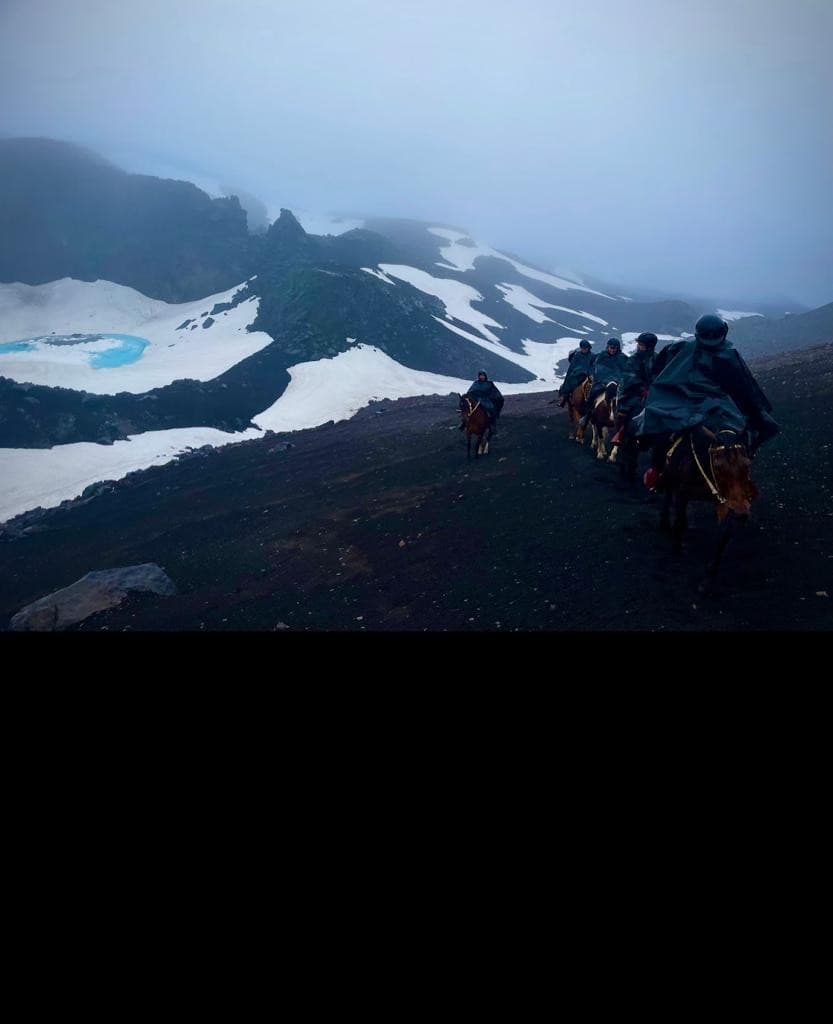 We will complete the customs formalities at the Chilean border and continue into the mountains, where we will cross the actual border into Argentina on foot. Here, we will say goodbye to our Chilean guides and horses, meeting our new traveling companions just a few meters ahead. They will accompany us for the next three days through the stunning Argentine Andes. We will ride on the Mahuida Volcano, which exceeds 2000 meters in height. Dinner and overnight stay in camp.